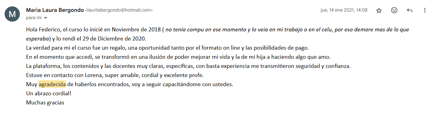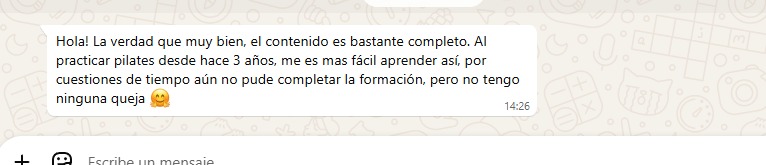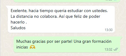 Estoy muy conforme con tus clases nunca imaginé que podría por fin poder estudiar de una manera tan maravillosa para mí. Estando en casa y estudiar con calma.