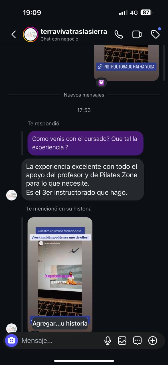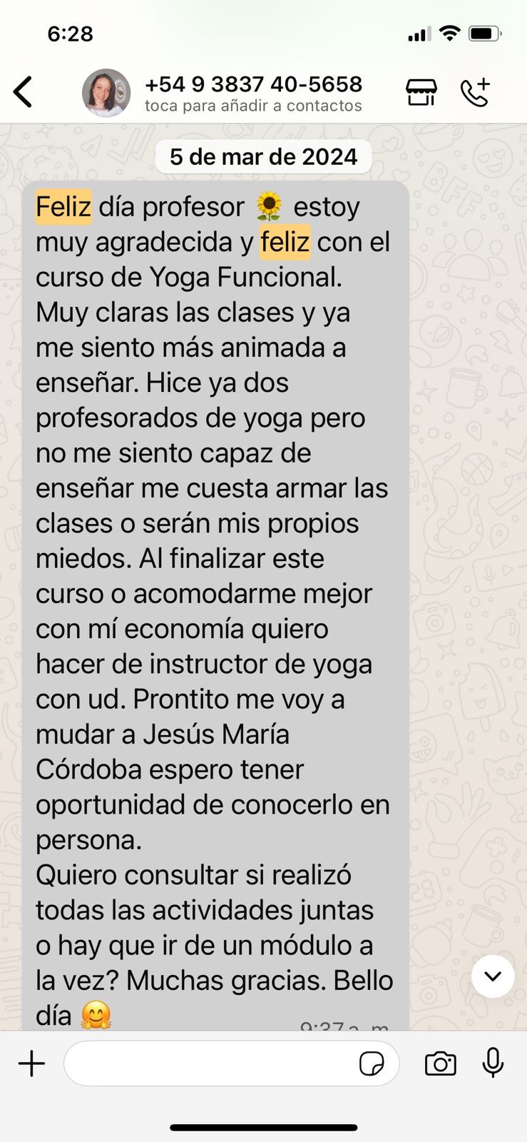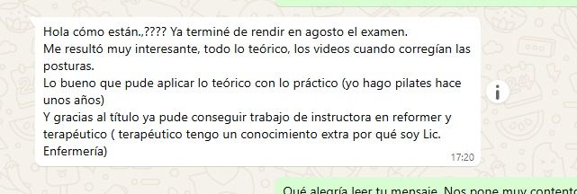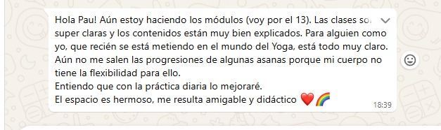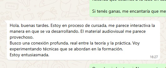 "En esta primera semana que estoy transitando en la formación, y por primera vez, debo decir que me ha despertado un profundo respeto por la disciplina y la calma espiritual que me despierta la práctica diaria. Estoy transitando episodios de ansiedad y opte por esta formación como auxilio y poder algún día transmitir lo que cultive.