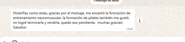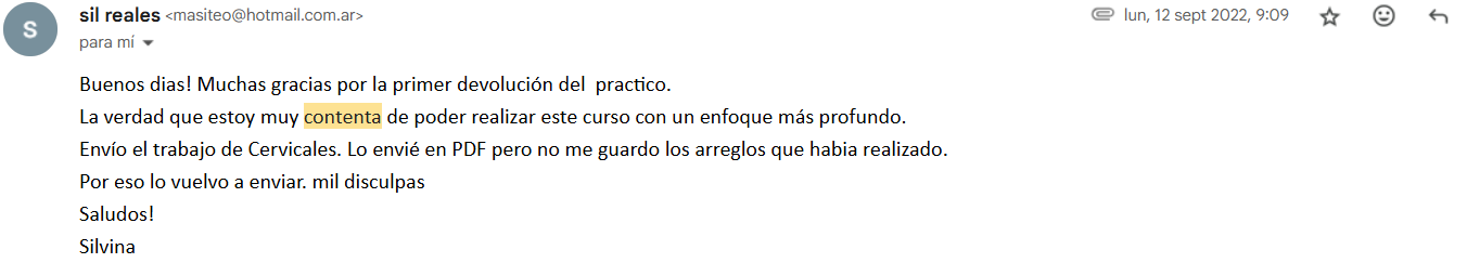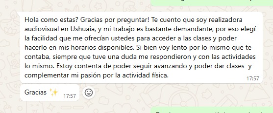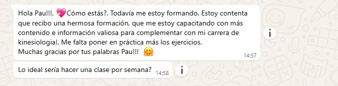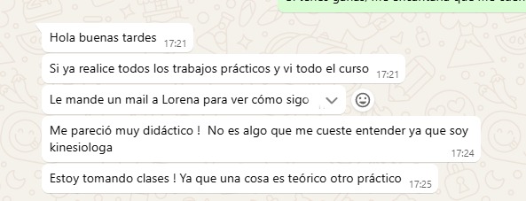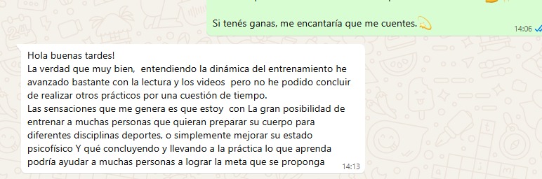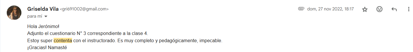 "Buen dia profesor , a medida que avanzan las clases lo que más me gusta aparte de los conocimientos que voy adquiriendo es la mezcla de frases y enseñanzas que afirman verdades necesarias que valoro tanto, escuchar el cuerpo, el valor de la práctica diaria, gracias por esa mirada necesaria a la hora de enseñar me sirve mucho lo valoro.Muchas gracias