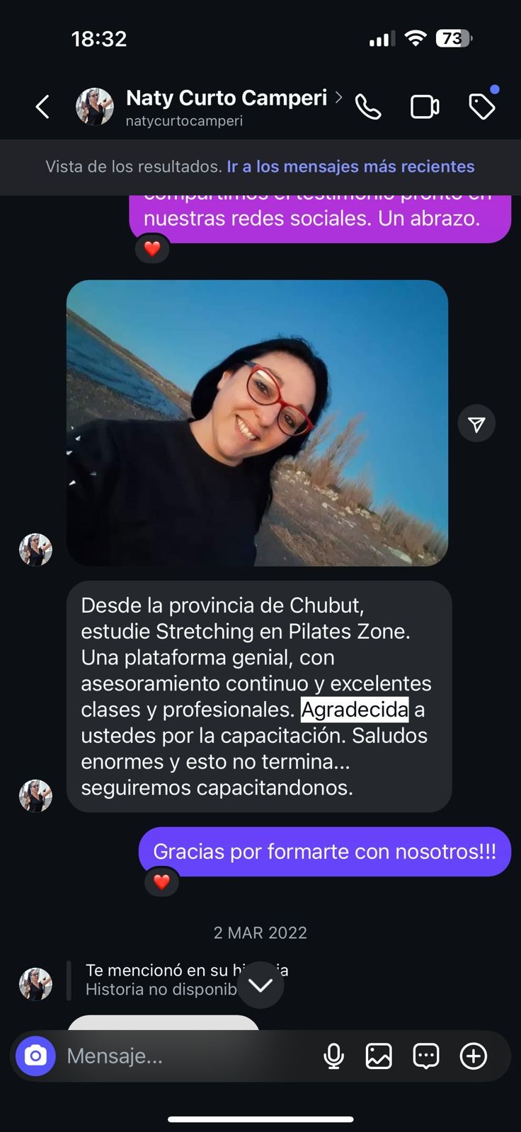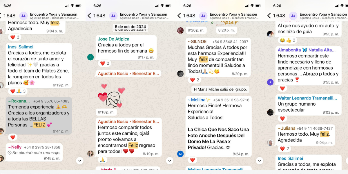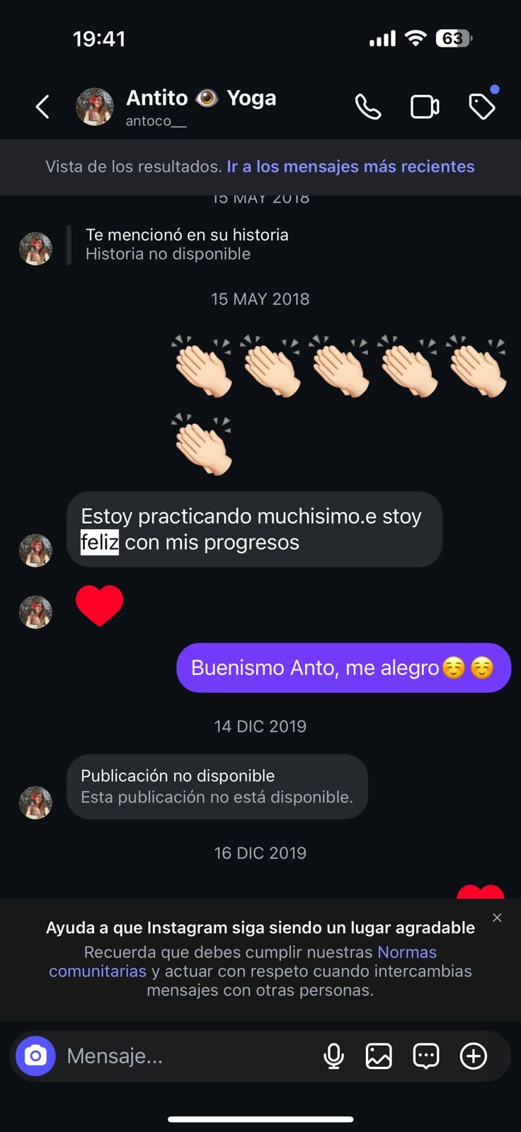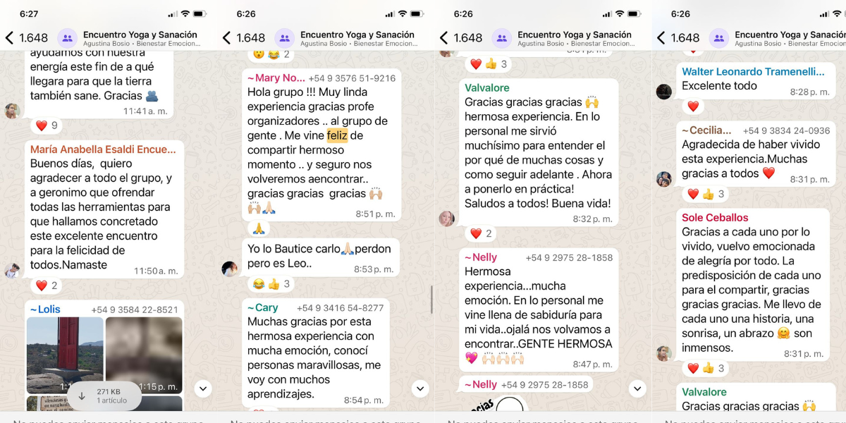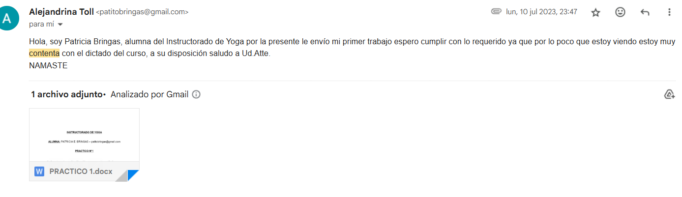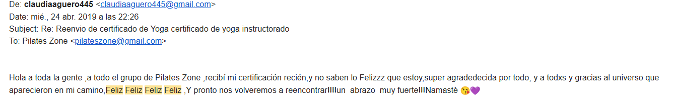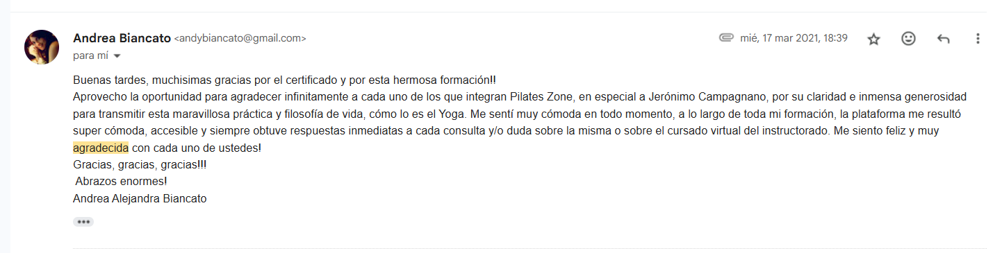 quería agradecerle por las palabras que me dedico cuando retome el instructorado, fueron de gran ayuda para mí. Le cuento que yo hago natación, hace poco y me había bloqueado a tal punto que no podía desprenderme del flotador porque sentía que me iba al fondo, empecé a practicar yoga a diario por las mañanas y fue increíble, cuando me vuelvo a enfrentar con la pileta me sentí totalmente libre y pude nadar sin inconvenientes. Gracias infinitas.